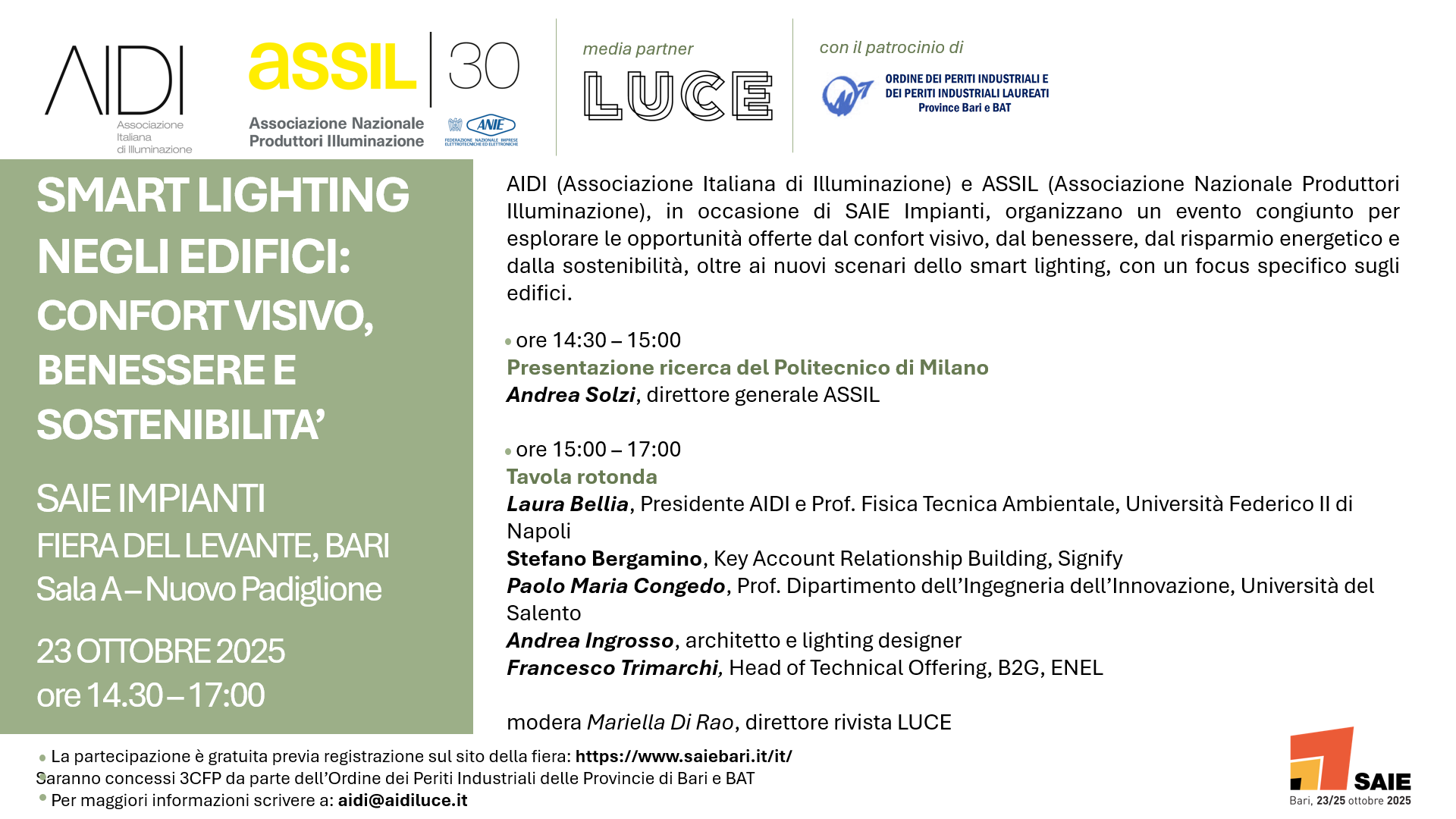 AIDI (Associazione Italiana di Illuminazione) e ASSIL (Associazione Nazionale Produttori Illuminazione), in occasione di SAIE Impianti, organizzano un evento congiunto per esplorare le opportunità offerte dal confort visivo, dal benessere, dal risparmio energetico e dalla sostenibilità, oltre ai nuovi scenari dello smart lighting, con un focus specifico sugli edifici.